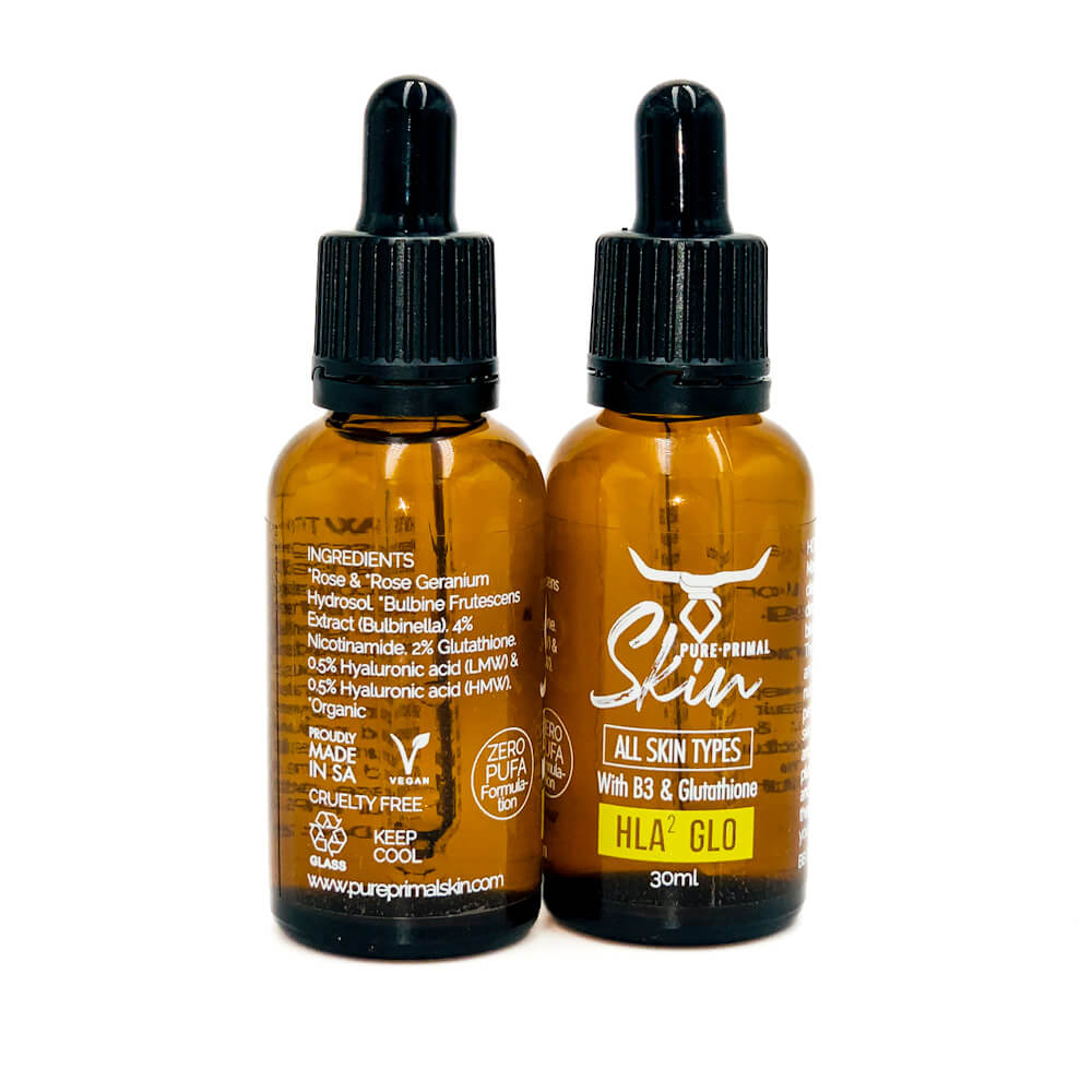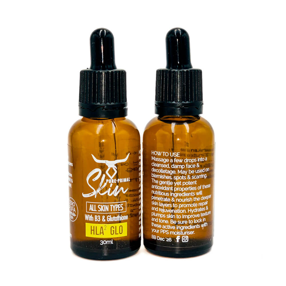 ALWAYS apply a moisturiser (cream or oil) after applying HLA² Glo Ⓥ to ‘lock-in’ the hydration properties of the serum.