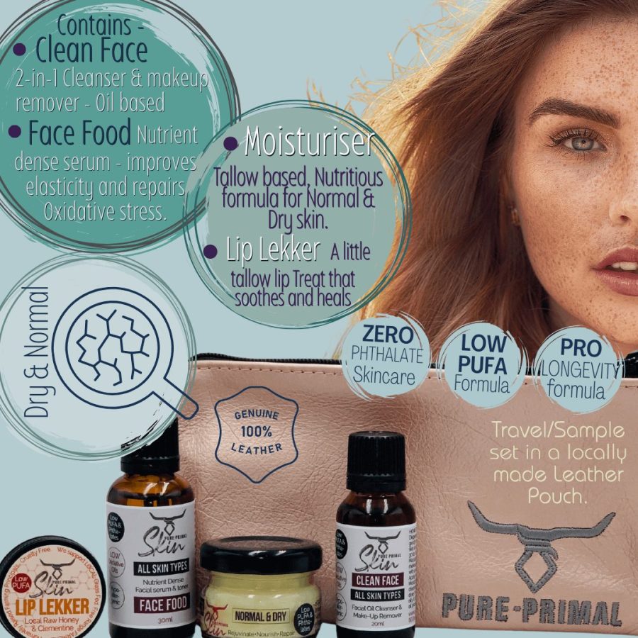Choose any product from the options provided. Most of the products are the Travel Sized versions of products to nourish normal & dry skin types. Some are from the Standard Pure Primal Skin Range and others are from the Premium Range with lanolin. The products to choose from ranges from a Cleanser to natural lanolin based Lip Colours.